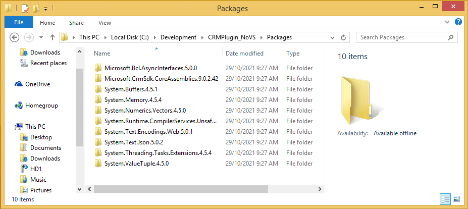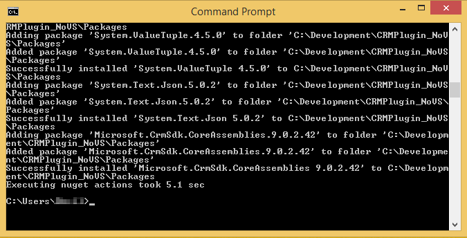 nuget install Microsoft.CrmSdk.CoreAssemblies -OutputDirectory C:\Development\CRMPlugin_NoVS\Packages