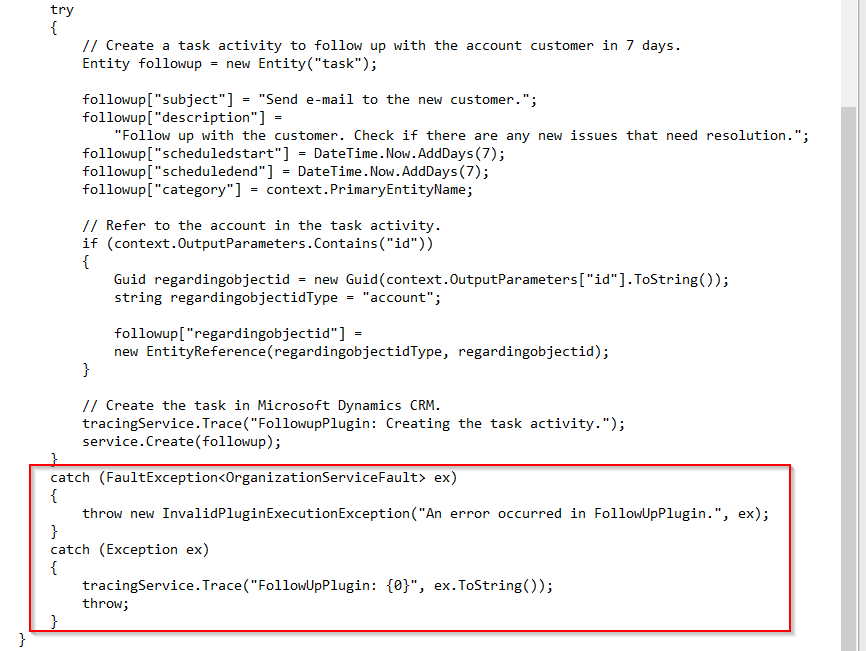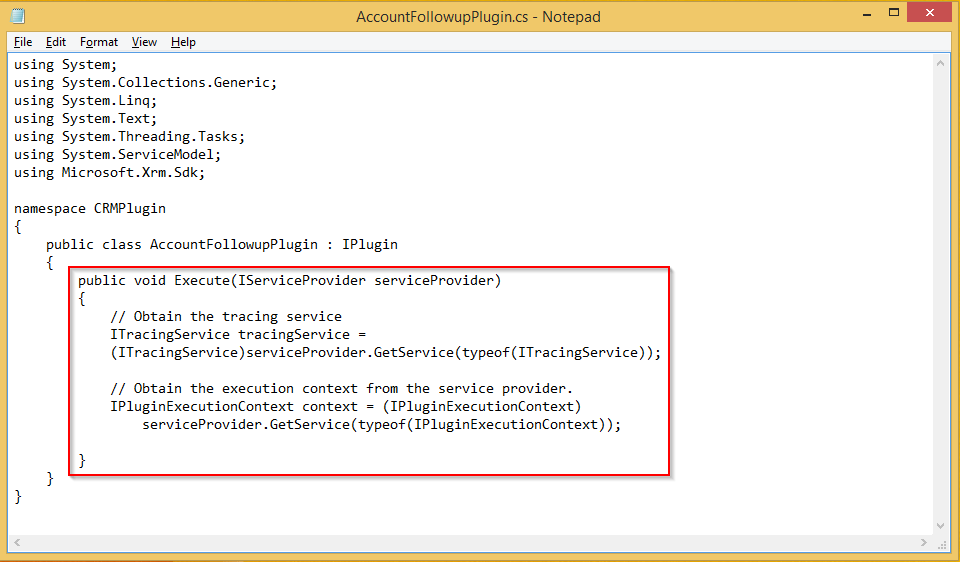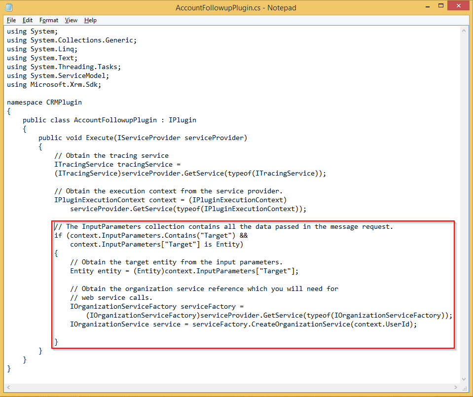 Start by typing in the following code into the AccountFollowupPlugin.cs file.