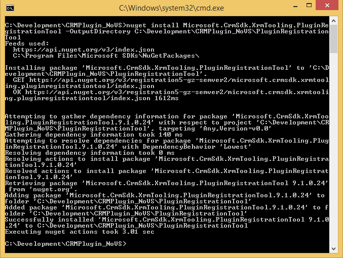 nuget install Microsoft.CrmSdk.XrmTooling.PluginRegistrationTool -OutputDirectory C:\Development\CRMPlugin_NoVS\PluginRegistrationTool
