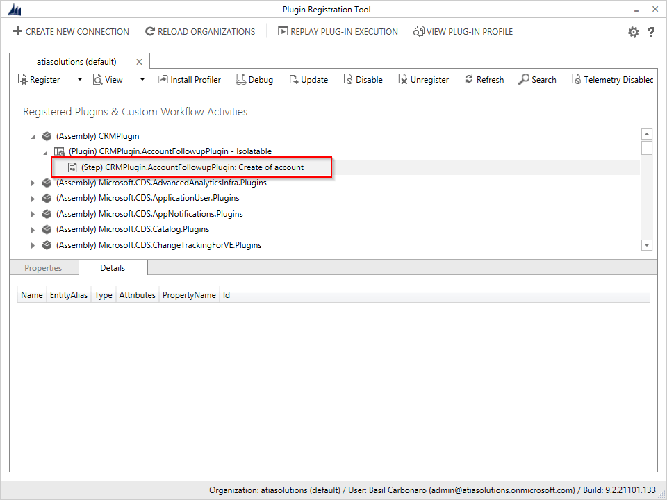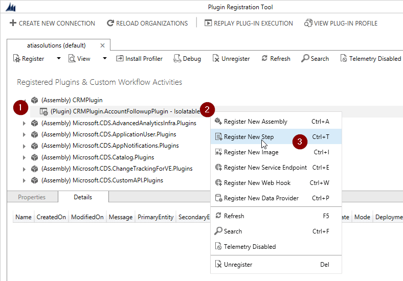 Next expand the (Assembly) CRM Plugin tree item and select the Register New Step menu option from the (Plugin) CRMPlugin.AccountFollowupPlugin – Isolatable entry.