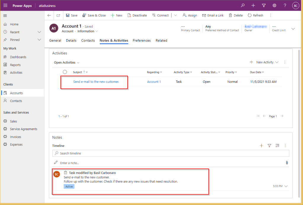 You will now be able to create a new Account record and the CRM Plugin step will automatically create a new follow up activity linked to the account as shown below.