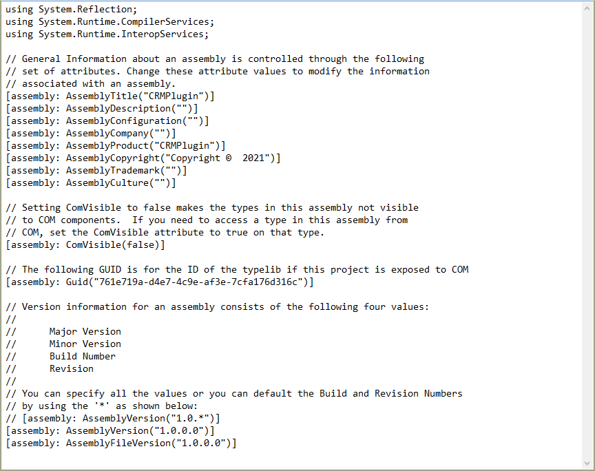 Next create a sub folder called Properties in the CRMPlugin folder and create a file called AssemblyInfo.cs in the Properties sub folder.