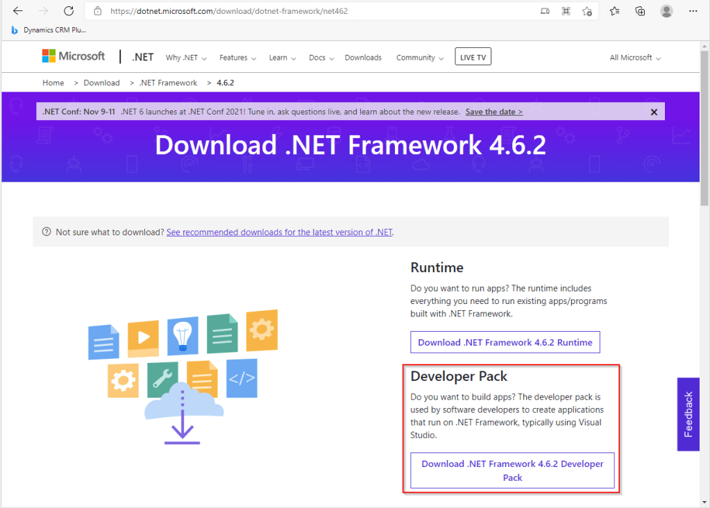 Next install the .NET Framework 4.6.2 by going to the following URL and downloading the Developer Pack.