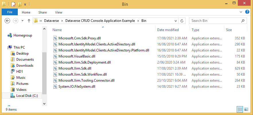 The Bin sub folder contains the DLLs shown below. Normally all DLLs would reside in a packages folder after running NuGet but to keep things simple, the DLLs will be located in the Bin subfolder where the executable for the Console Application will be located when the code is compiled.