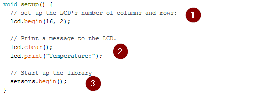 - The temperature sensor interface is initialised making reference to the OneWire object that will be used to send and receive messages to and from the temperature sensor.