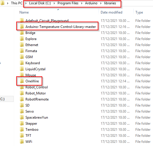 Copy the folders highlighted above to the following subfolder in the Arduino IDE installation folder.