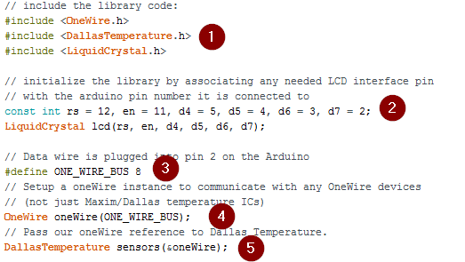 - Defines the Arduino UNO pin that will be used to serially communicate with the temperature sensor