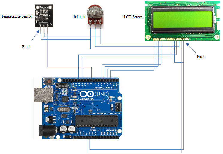The following picture shows the temperature monitor that I have built where you can clearly see the Arduino Uno board and the LCD screen but not the temperature sensor or the trimpot.